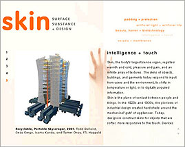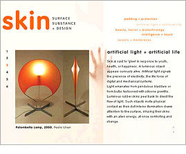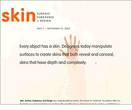Blasse)、モーフォシス(Morphosis)、マルセル・ワンダース(Marcel Wanders) を初めとする著明なデザイナーの作品を展示、ファッションからプロダクト、建物、そして我々の生きたスキンを含む現代生活の中でいかにしてそれらのクオリティーの高い、シミュレートされた優秀なスキンが発見されたかを表している。