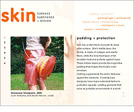 「SKIN」Hiroko Sueyoshi Planners, New York “Every object has a skin” すべてのものにはスキンがある、スキンとその中身の関係性を今日のデザイナーがいかに取り組んでいるのか、その挑戦ははかりきれない、クーパー・ヒューイット美術館で開催されている展覧会「SKIN」は、バイオテクノロジーを含む最新技術の発達によって、デザインが今や我々の生活環境のみならず、整形手術に代表されるように我々自体にまでおよぶようになっているその現状を改めて認識させるものとなった。一方、すべてがますます高度で複雑に多様化されていく現状下、そのテーマの重要性をいかに、限られた時間、空間、予算の中で展覧会としてコンテンポラリーデザインにおけるその取り組むの重要性を検証するのかという課題を考えさせるものにもなった。