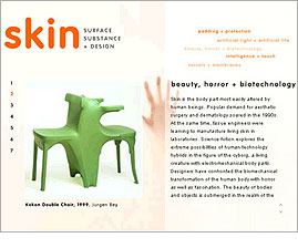 展示は人間のスキンの持つ機能に基づき5つにわけられている。 ・ Beauty, Horror + Biotechnology 展示はオブジェの他、写真、ビデオ、医療、アート、建築、エンターテイメント、娯楽、洋服、ファッション、日用品、戦争のフィールドまでカバーし、ハリウッドのフランケンシュタイン、そして最後のカテゴリーにはアメリカの陸軍からのコミッションでマウロ・タリアニ(Mauro Taliani) がデザインした兵隊を高熱から守るクーリングシステムベスト(冷却装置付ベスト)や原子力爆発まで加えられその範囲は膨大だ。